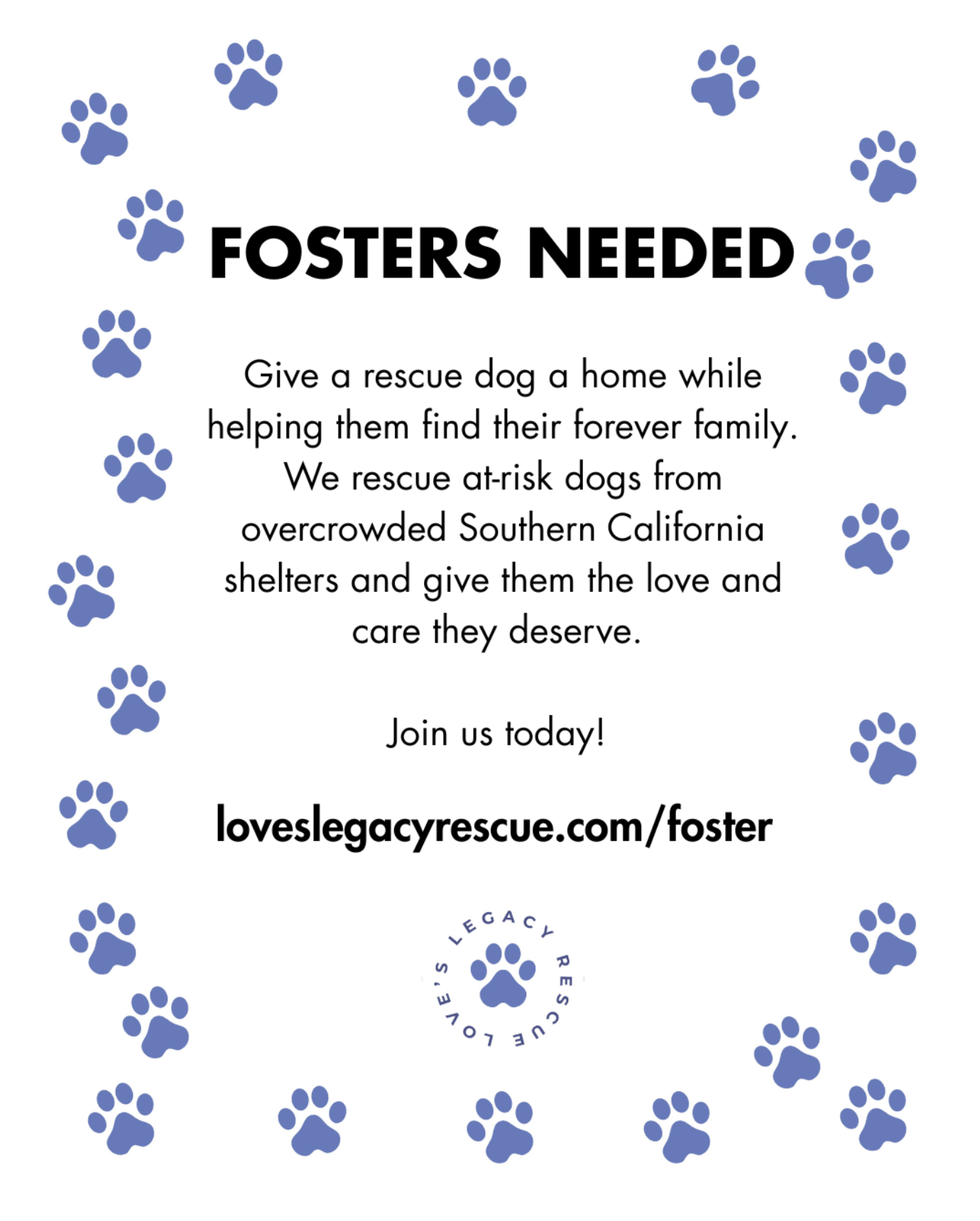 We want to grow our foster network as much as possible, especially in California, Oregon, Washington, Nevada, and Colorado. We facilitate transport directly to you and also to adopters.